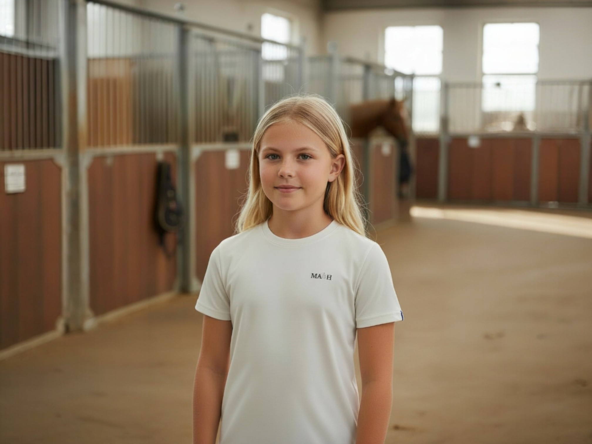 Offrez à votre jeune cavalier tout le confort et l’élégance du t-shirt blanc MAÖH, conçu spécialement pour les passionnés d’équitation.